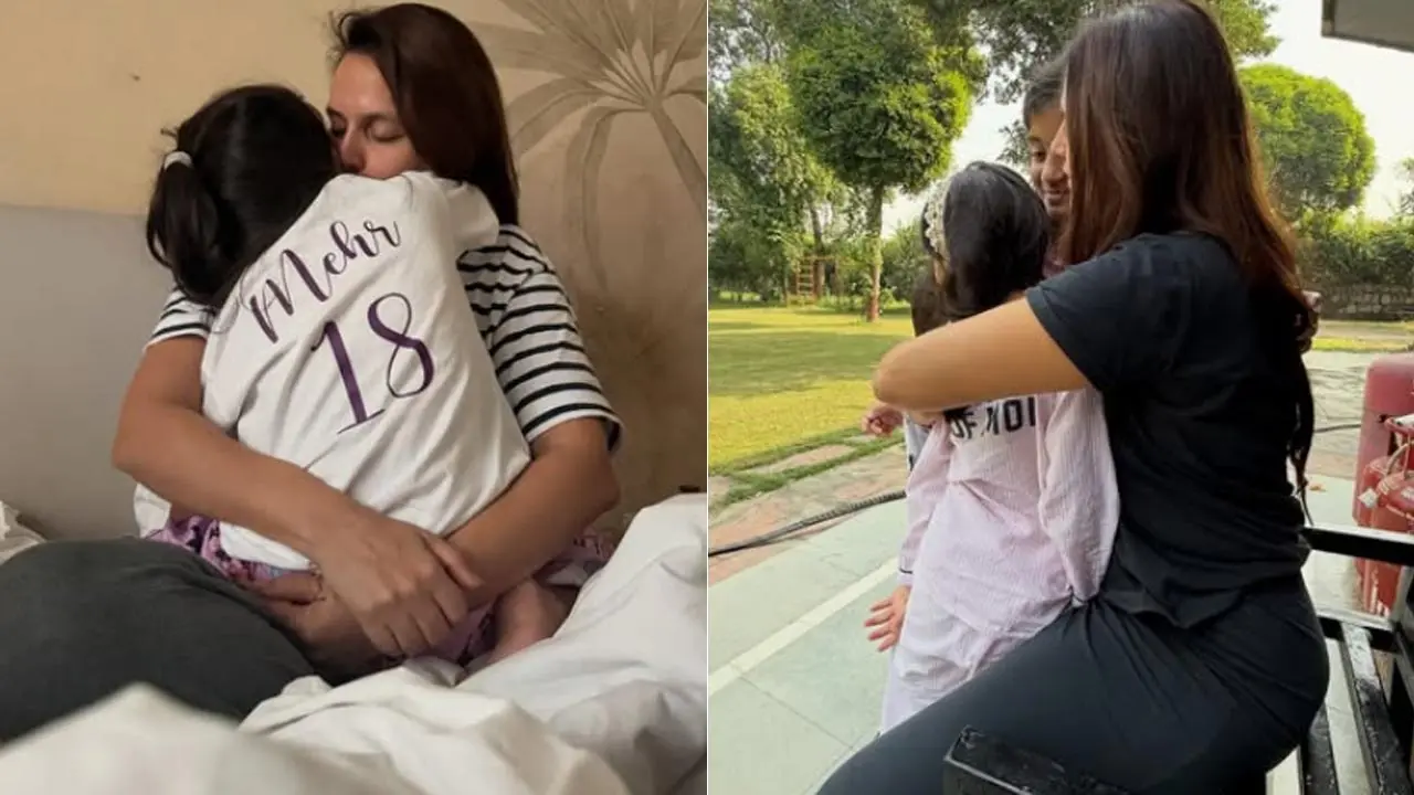 The photos and videos show Neha hugging little Meher, enjoying a beautiful sunset together, and the little one doing her mother`s makeup.