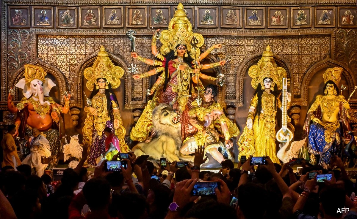 A pavilion in Kolkata is decorated with giant computer keyboards and flashing lights, set against a backdrop resembling IT office towers.